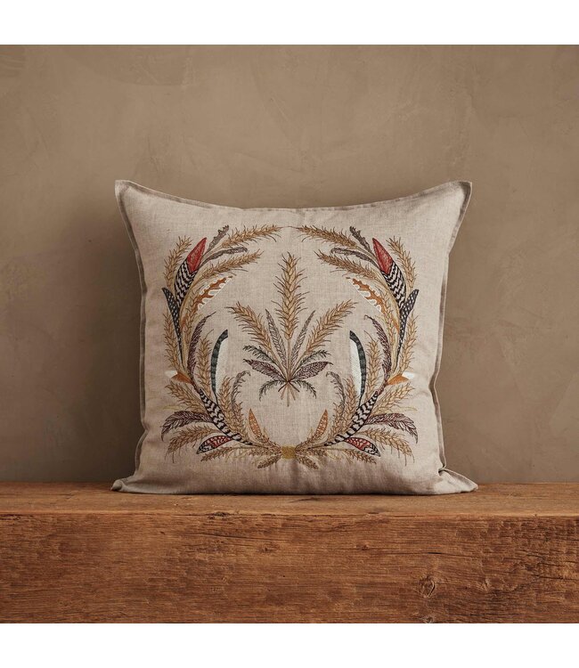 Welcome the harvest season with our Wheat Harvest pillow. This autumnal pillow is embroidered with a wreath of wild grasses, grains, stalks of wheat, and found feathers. Stitched in gold metallic, ecru, burnt orange, and blue-gray threads.