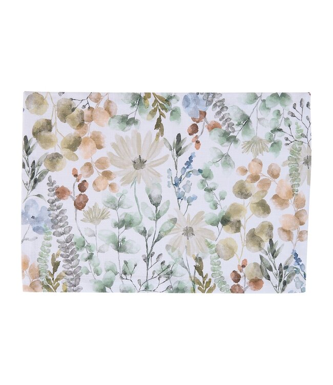 Soft, subtle hues gracefully blossom into a chic plant pattern for a trendy flair in any table setting. This nature patterned placemat set of four features an intricately detailed design of delicately flowering eucalyptus and other plants in refreshing green, orange, and blue hues; perfect for creating a serene atmosphere all year round. The cozy colorway and beautiful botanicals makes these decorative dinner mats great for adding a fresh and casual feel to your home space. Soft and absorbent to the touch, these kitchen textiles are constructed of premium cotton blend material that makes them well-suited to both every day and special occasion meals. Utilize on their own or create a wonderful dinner arrangement with various decorative table accents that will elegantly elevate any spring farmhouse, country chic, summer, cottagecore, or whimsical boho table decor.