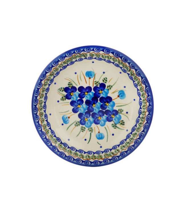 This Polish Pottery 9" Pasta Bowl - Blue Pansy is handmade and handpainted by the Ceramika Bona factory in Boleslawiec, Poland.