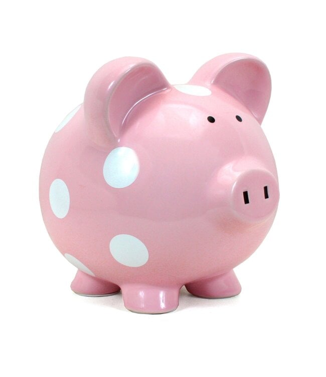 This charming piggy bank features a classic pink finish adorned with large white polka dots, making it a playful yet timeless addition to any child's room or family keepsake collection. Its handpainted design adds a personal, artisanal touch that enhances its appeal as a memorable gift or treasured item.