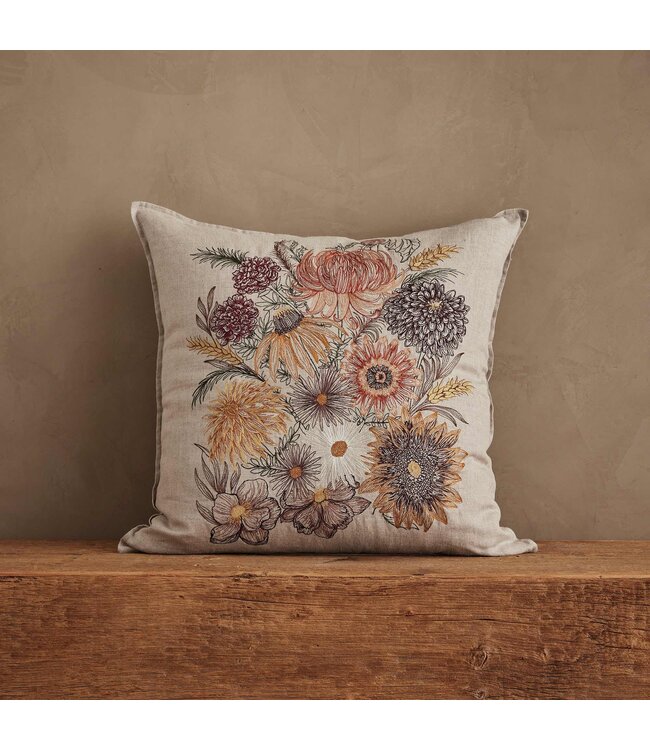 As the leaves change, fall flowers flourish in our gardens. Their blossoms are rich in color and texture, from the bright blooms of marigolds to the rounded petals of chrysanthemums. These final blooming beauties are part of what makes the season so bewitching. Our Autumn Blossoms design embraces the brief moment when nature shines with golden foliage and flowers. Embroidered in hues of coral, deep red, and ochre, find anemones, black-eyed Susans, dahlias, sunflowers, mums, and marigolds in all their glory on the Autumn Blossoms pillow.