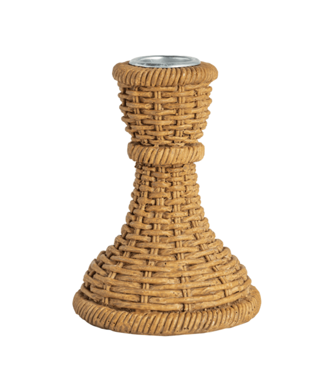 Resin Woven Taper Holder, crafted with a rattan-style design, offers a sophisticated touch to any setting. This elegant holder is made from high-quality resin, ensuring durability and a lightweight feel. Its intricate woven pattern adds texture and visual interest, making it a perfect centerpiece for dining tables, mantels, or any space that needs a stylish accent. The holder is designed to securely fit standard taper candles, providing a stable and safe display. Ideal for both indoor and outdoor use, it complements a variety of decor styles, from modern to rustic. Enhance your ambiance with this versatile and timeless piece.